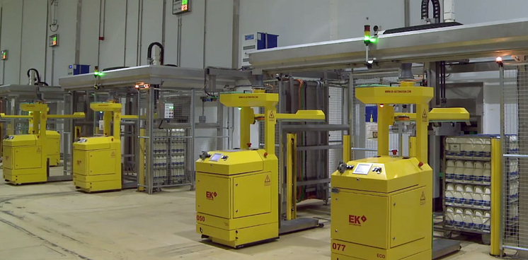Arla Aylesbury is one of the World's largest fresh milk processing plants - in dispatch htey use robots to moved the finished products around.