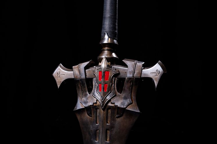 The sword was crafted over a number of months by renowned swordsmith, Tod Todeschini, who meticulously captured Clive Rosfield’s sword’s intricate details through a variety of metal working techniques. Using a mixture of traditional techniques and the latest technological advancements in sword making, the lower part of the blade was ground from solid steel using belt finishers and hand grinders and then a long steel peg was welded-on, which went from the blade ridge to the end of the pommel. The upper part of the blade was then made from two hollow shells, then welded together and cleaned using belt and hand grinders. The final pieces of detail at the top of the blade were formed and spot welded in place to complete the blade.