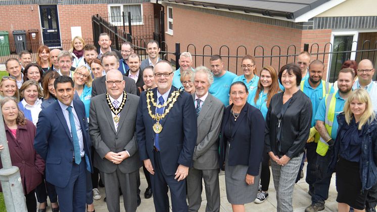 Picture: The official ‘reopening’ of St Thomas estate after a £2 million refurbishment, with (front, from left) Cllr Rishi Shori; Ian Hargreaves; the mayor, Cllr Mike Connolly; Hugh Broadbent, chair of Six Town Housing; Pat Jones-Greenhalgh, the council’s executive director of communities and wellbeing; and Sharon McCambridge, Six town Housing chief executive.