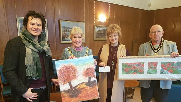 Picture: The Mayor of Bury, Councillor Dorothy Gunther, and her husband and consort Mr Michael Gunther, receive the paintings and donation from MASA-UK owner Matija Sapundzieska and her son Kiko Sapundjija.
