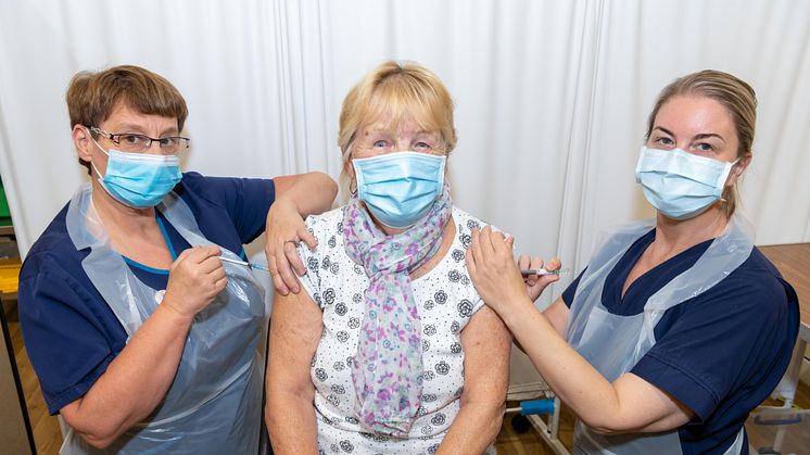 Picture: At the double – Shirley Holden gets her Covid booster and flu jabs from vaccination team members Julie Taylor and Nicola Battle.