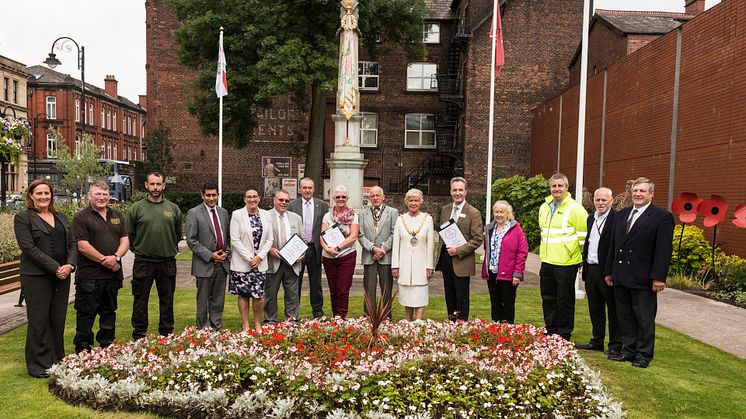 Picture: Outside the Fusilier Museum are (from left) Julie Gonda, interim executive director of communities and wellbeing; Peter Turner, Bury North area supervisor, grounds maintenance; Dave Sweeney, gardener; Cllr Rishi Shori, leader of the council; Pat Jones-Greenhalgh, interim chief executive; Mel Henley, RHS Britain in Bloom judge; Graham Schoon, countryside officer; Ruth Growney, RHS Britain in Bloom trainee judge; Michael Gunther, the mayor’s consort; the Mayor of Bury, Cllr Dorothy Gunther; Andrew Jackson, RHS Britain in Bloom judge; Julie Pitchforth, marketing and development officer; Kevin Dickinson, grounds maintenance manager; Peter Burns, senior supervisor, street cleansing; and Peter Glover, technical officer.