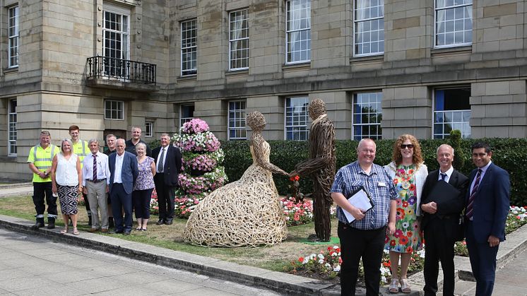 Picture: Outside Bury Register Office, with the new wicker bride and groom, are (from left) Pete Turner, Beverley Wood, Liam Baker, Ken Brown, Brian Robinson, Pete Burns, Kevin Dickinson, Julie Pitchforth and Peter Glover, with (far right) North West in Bloom judges Stephen Lowe and David Bielawski, plus the Mayor of Bury, Councillor Jane Black, and the leader of the council, Cllr Rishi Shori.