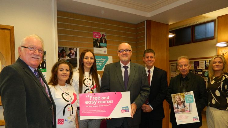 Picture: At the Go Online Week launch are (from left) Cllr Trevor Holt; Hannah Stredder, digital coach; Kate Hobson, digital coach; Cllr Mike Connolly; Mike Owen, the council’s executive director of resources; Cllr Peter Bury; and Claire Jenkins, the council’s head of customer support and collections.