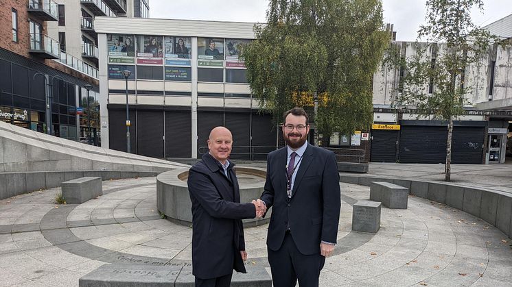 Picture: David Burkinshaw, development director at Muse Developments, and Cllr Eamonn O’Brien, leader of Bury Council, at the Longfield Centre in Prestwich.