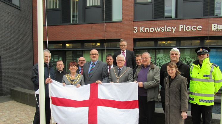 Picture attached: The Mayor of Bury, Councillor Joan Grimshaw, hoists the St George’s cross at Union Square, accompanied by her guests.