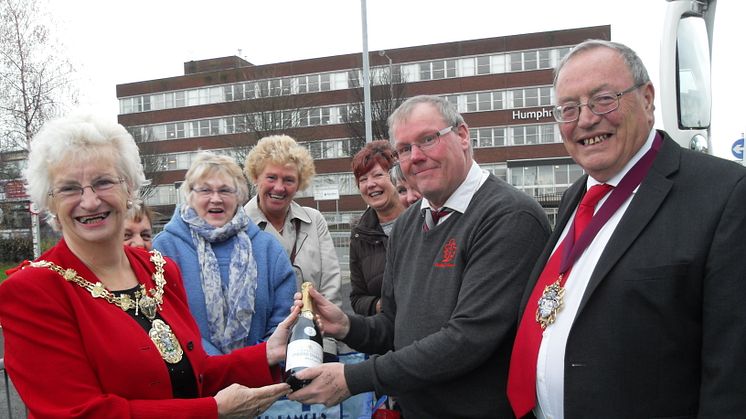 Picture:Terence Carpenter receives his bottle of champagne from the Mayor of Bury, Cllr Stella Smith, and her consort Mr John Smith.