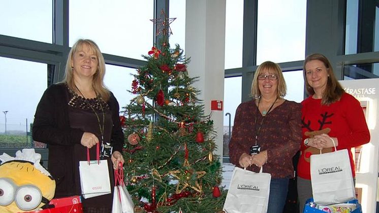 Picture: With just a few of the gifts donated by L’Oreal are (from left) Sue Harris, manager of Bury Children and Young People in Care team; Wendy Powell and Nicola Pinder, child and family workers in the team.
