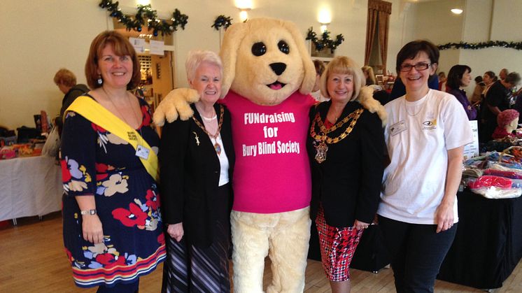 Picture: At the craft show are (from left) Jane Deakin, volunteer co-ordinator; the deputy mayoress, Mrs Shirley Rabbitt; the charity's mascot; the deputy mayor, Cllr Sharon Briggs; and Jill Logan from Bury Society for Blind and Partially Sighted People.