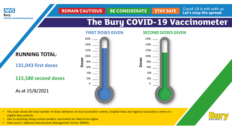 The latest figures show that 131,043 people across Bury have now had one dose of the vaccination, and 115,580 of them have had both jabs.