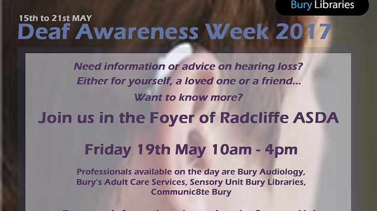 The event, from 10am to 4pm, takes place during Deaf Awareness Week (15-21 May). For more information, call the sensory officer at Whitefield Library on 0161 253 7512 or email sensory.lib@bury.gov.uk