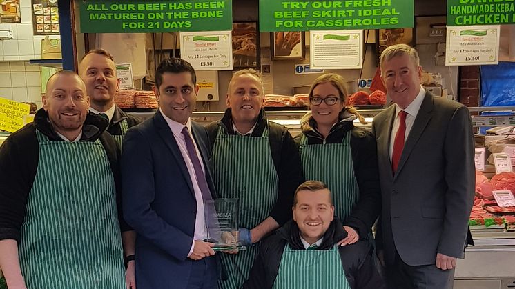 Picture: Markets manger Andrew Heyes and council leader Rishi Shori with the Britain’s Favourite Market trophy, along with the traders from W&M Butchers, one of the stalls that had a ‘secret shopper’ visit which formed part of the award judging.