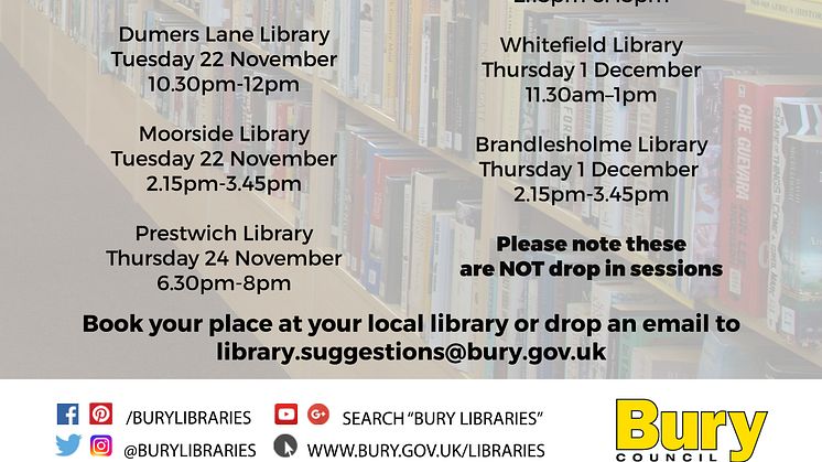 NB: These sessions are not drop-in – if you want to attend, you must book a place at your local library. Alternatively, you can email your ideas to library.suggestions@bury.gov.uk