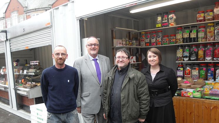 Picture attached: Open for business on Radcliffe Piazza – at the temporary market are (second left) Cllr Mike Connolly and market traders Brendan Farrington, Andrew Shaw and Beth Tramayne.
