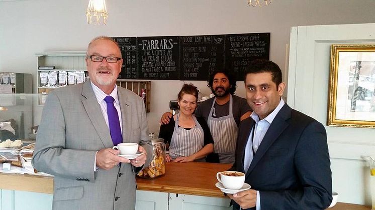 Picture: At the newly opened Farrars Cafe and Tea Room are (front) council leader Cllr Mike Connolly and deputy leader Cllr Rishi Shori, with (back) cafe owners Jodie Bannister and Asif Hayat.