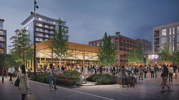 - A new market hall providing smaller spaces for local retailers to thrive and grow. This includes a food hall for local food operators and communal seating that spills out onto the village square.
