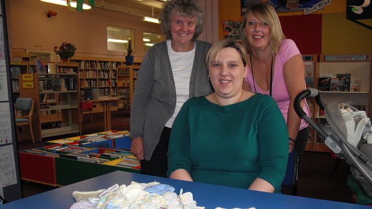 icture attached: Laura Woodhouse (seated) of Lisa’s Stars receives the knitted items from (back, left) Radcliffe Knitting Group member Linda Oliver and assistant librarian Julia Taylor.