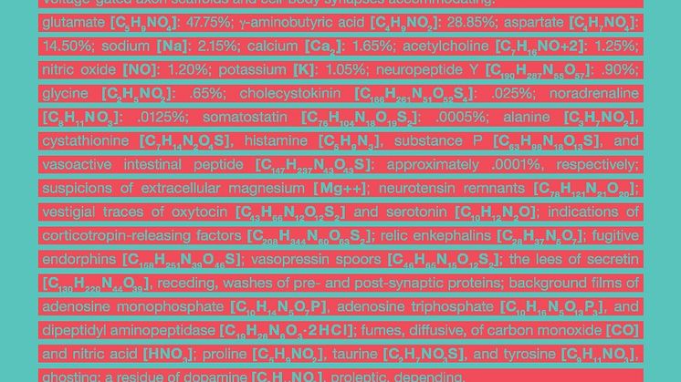 Picture: Craig Dworkin, FACT, 2016 (This text records the relative molecular weights of the neurotransmitters activated in the brain when it is read)
