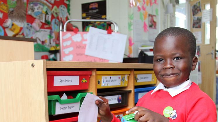 Picture attached: Helping to spread the recycling message is Kenyi Jogo, a pupil at Mersey Drive Primary School in Whitefield.