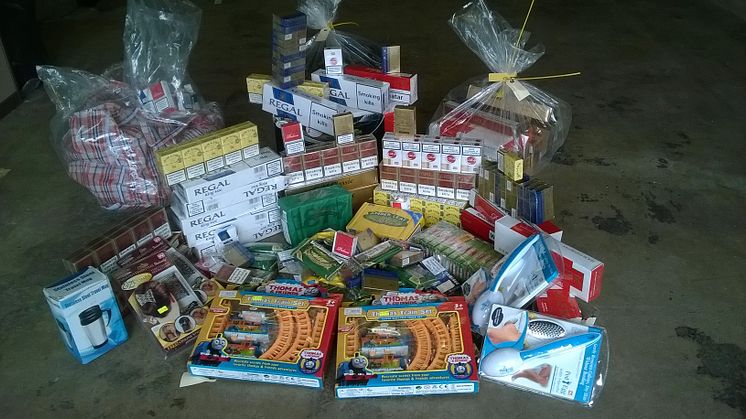 A variety of counterfeit goods were seized including Thomas the Tank Engine toys, JML personal products including Ped Eggs and EZ Combs, Golden Virginia tobacco and Regal cigarettes.