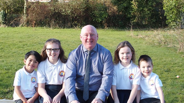 Picture: Celebrating their ‘outstanding’ Ofsted rating are Guardian Angels head teacher Dennis Harrison and pupils Joshua Branney and Ivan Marcos (Year 1) and Isabella Howarth and Jennifer Murphy (Year 5).