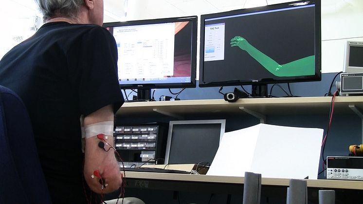 The new method uses muscle signals from the patient´s arm stump to drive a system known as augmented reality. The electrical signals in the muscles are sensed by electrodes on the skin. The signals are then translated into arm movements by complex algorithms. The patient can see himself on a screen with a superimposed virtual arm, which is controlled using his own neural command in real time.