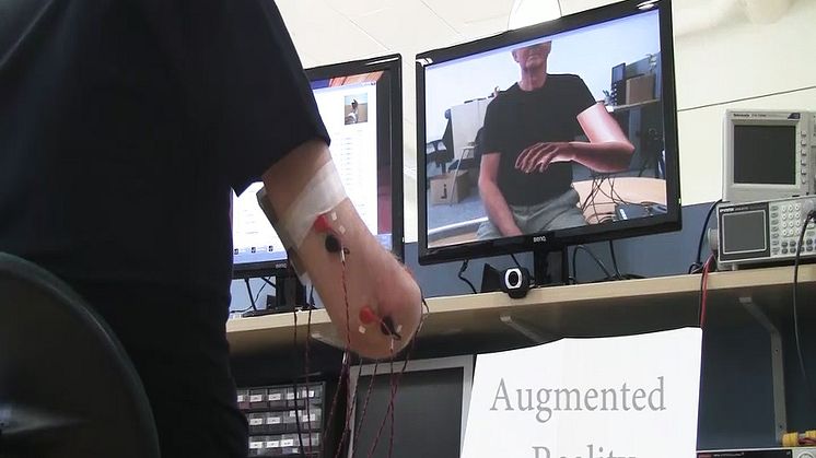 Caption: In the augmented reality environment, the patient can see himself with a superimposed virtual arm, which is controlled by muscle signals from his arm stump.