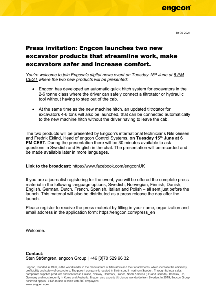 100621_Press_Press invitation- Engcon launches two new excavator products that streamline work, make excavators safer and increase comfort