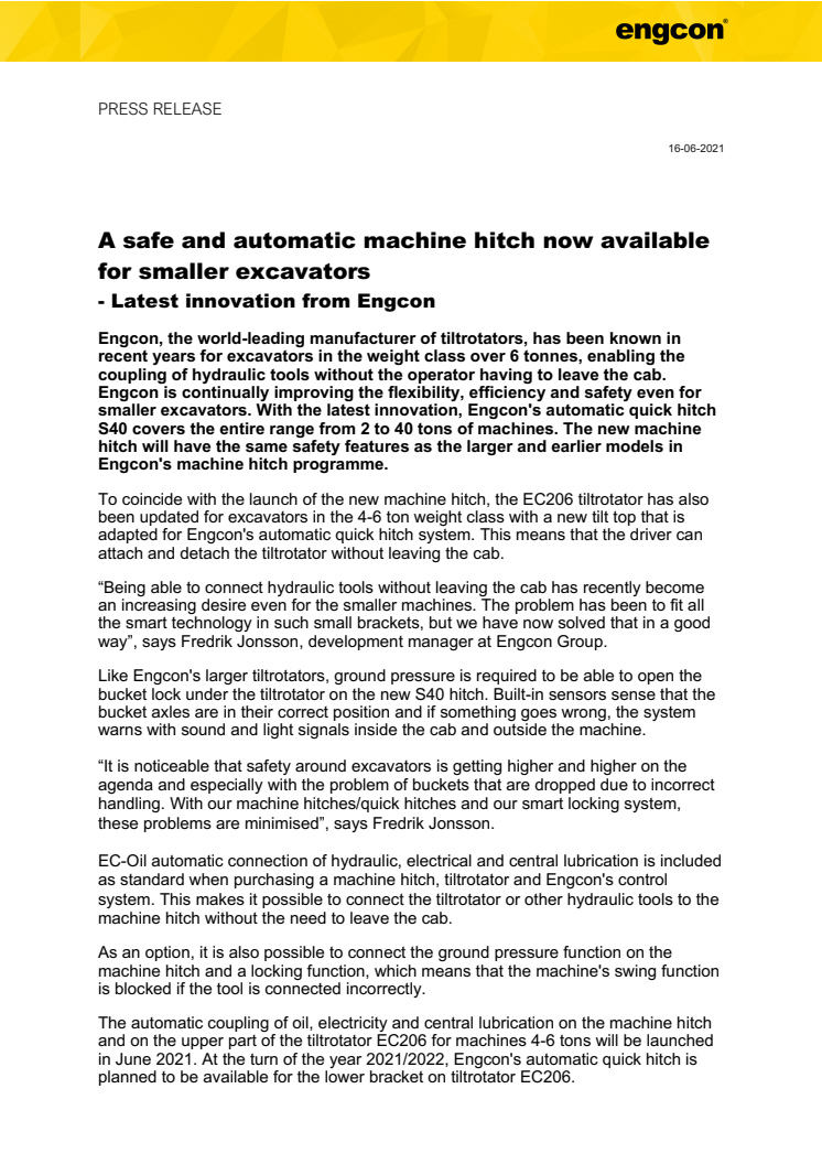 160621_Press_A safe and automatic machine hitch now available for smaller excavators