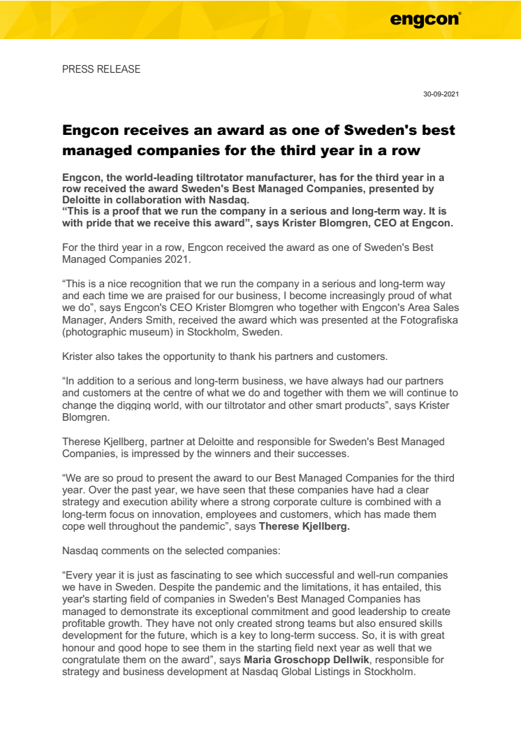 300921_Press_Engcon receives an award as one of Sweden's best managed companies for the third year in a row
