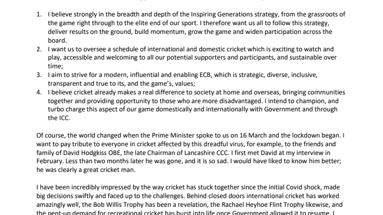 “I’m delighted to officially start my role as Chair today following a really informative and consultative onboarding process led by Tom Harrison and his team. I am grateful to everyone I have met at the ECB, the First Class Counties and the Recreational Game for their welcome, help and advice. It is a privilege to succeed outgoing Chair, Colin Graves, and I would like to thank him for his tremendous achievements in the role.