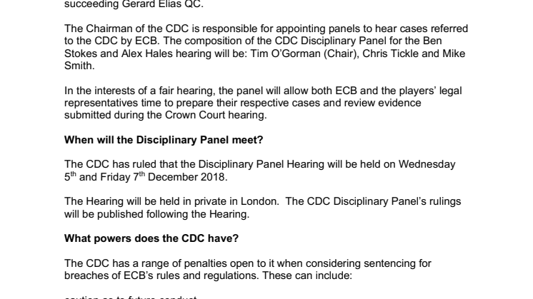 Who: The composition of the CDC Disciplinary Panel will be: Tim O’Gorman (Chair), Chris Tickle and Mike Smith.