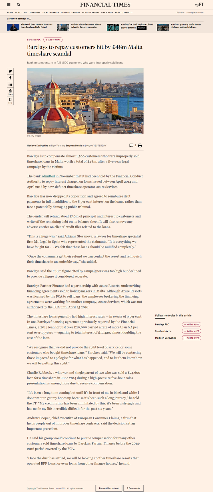 Financial Times story June 18th 2021. Barclays Partner Finance admits defeat after campaign by timeshare lawyer supported by European Consumer Claims