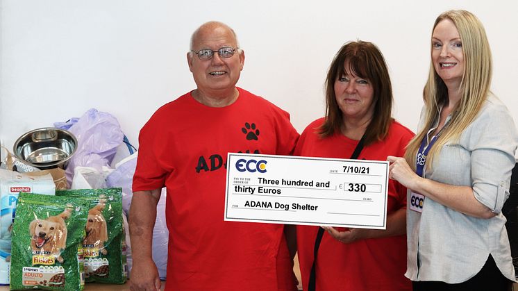 "When our staff saw that ADANA needed money and supplies, they were determined to help," explains Sharon Johnson, department head at ECC. "They donated money (a total of €330), dog blankets, food bowls; whatever they could spare. We were delighted to be able to hand over the results of our staff's generosity and goodwill. Reg and Susan Brown (ADANA's president) came in person to collect the hundreds of euros, and physical supplies we gathered."