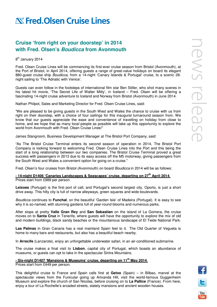 Fred. Olsen Cruise Lines will be commencing its first-ever cruise season from Bristol (Avonmouth), at the Port of Bristol, in April 2014, offering guests a range of great-value holidays on board its elegant 880-guest cruise ship Boudicca, from a 14-night ‘Canary Islands & Portugal’ cruise, to a scenic 28-night sailing to ‘The Adriatic with Venice’.