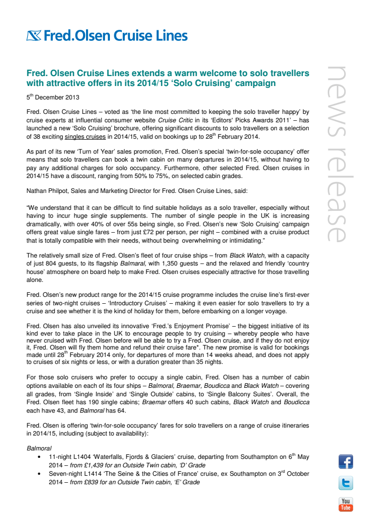 Fred. Olsen Cruise Lines – voted as ‘the line most committed to keeping the solo traveller happy’ by cruise experts at influential consumer website Cruise Critic in its ‘Editors' Picks Awards 2011’ – has launched a new ‘Solo Cruising’ brochure, offering significant discounts to solo travellers on a selection of 38 exciting singles cruises in 2014/15, valid on bookings up to 28th February 2014.
