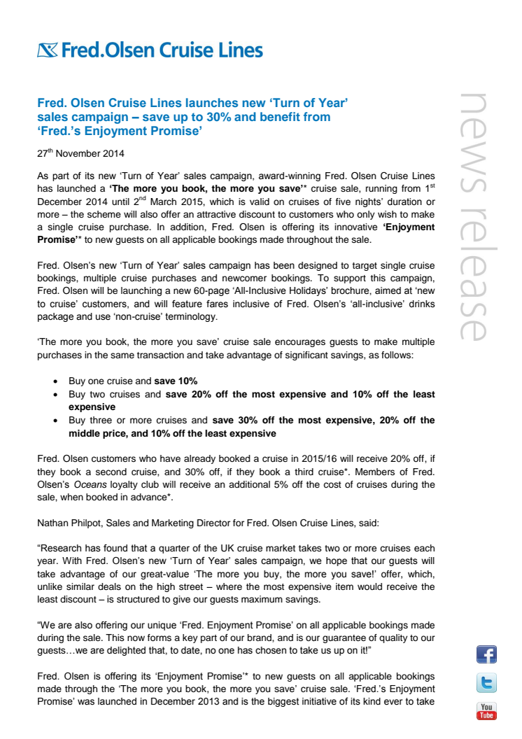 As part of its new ‘Turn of Year’ sales campaign, award-winning Fred. Olsen Cruise Lines has launched a ‘The more you book, the more you save’* cruise sale, running from 1st December 2014 until 2nd March 2015, which is valid on cruises of five nights’ duration or more – the scheme will also offer an attractive discount to customers who only wish to make a single cruise purchase. In addition, ...