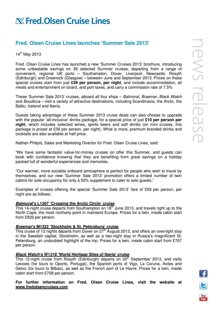 Fred. Olsen Cruise Lines launches ‘Summer Sale 2013’