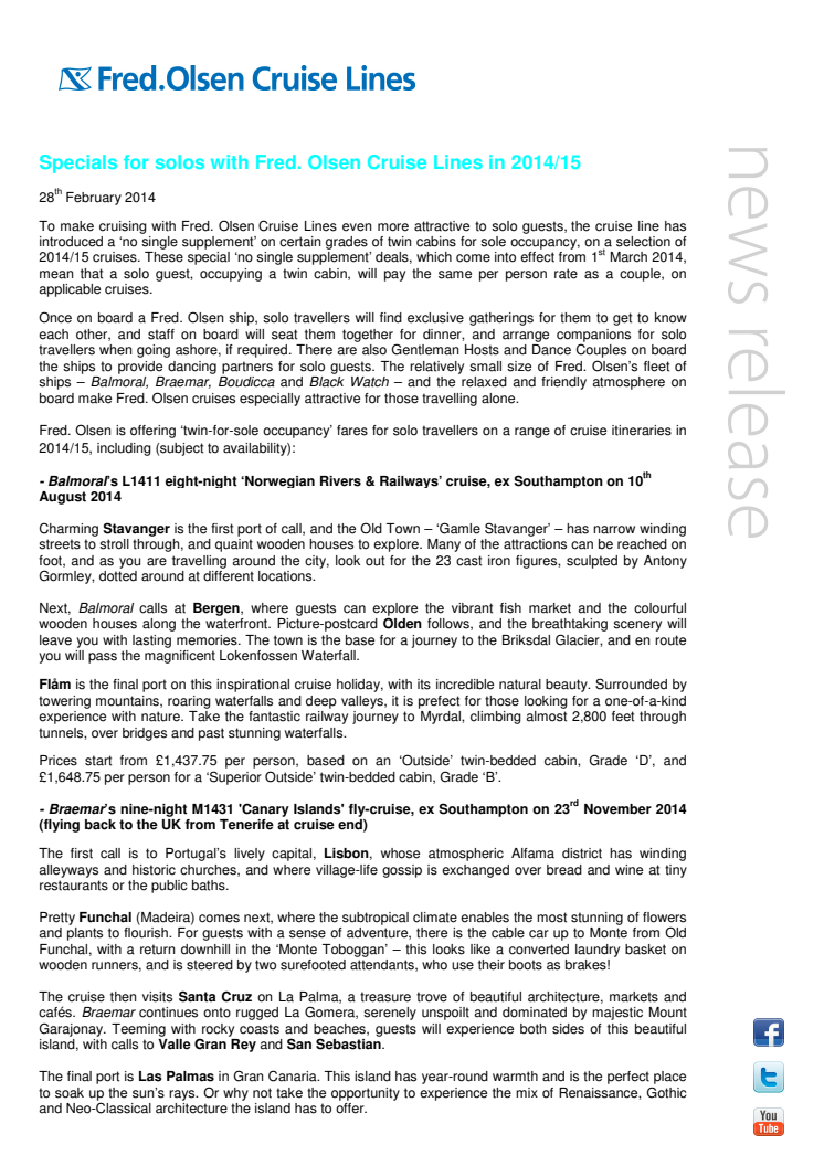 Specials for solos with Fred. Olsen Cruise Lines in 2014/15