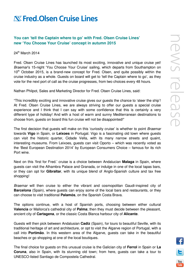 Fred. Olsen Cruise Lines has launched its most exciting, innovative and unique cruise yet! Braemar’s 15-night ‘You Choose Your Cruise’ sailing, which departs from Southampton on 10th October 2015, is a brand-new concept for Fred. Olsen, and quite possibly within the cruise industry as a whole. Guests on board will get to ‘tell the Captain where to go’, as they vote for the next port of call as...