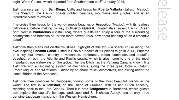 This exotic fly-cruise to the Americas and Caribbean is one of the sectors of Balmoral’s 104-night ‘World Cruise’, which departed from Southampton on 5th January 2014.