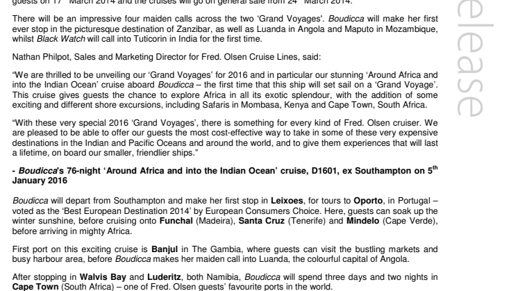 Fred. Olsen Cruise Lines is launching two new exhilarating ‘Grand Voyages’ in 2016: Boudicca's 76-night ‘Around Africa and into the Indian Ocean’ cruise, D1601, departing from Southampton on 5th January 2016 - the cruise line’s first ever sailing of this kind on board Boudicca – and Black Watch's 115-night 'Around the World with the South Pacific' cruise, W1601, departing from Southampton on 8th January 2016. Together, these two epic cruises will take in 70 ports in 42 countries around the globe.