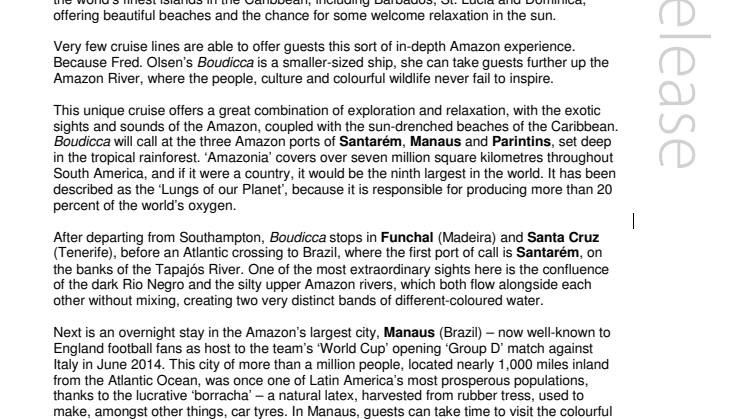 Fred. Olsen Cruise Lines’ 35-night D1405 ‘Amazon River & the Beaches of the Caribbean’ cruise, departing from Southampton on Boudicca on 22nd March 2014, is the perfect getaway for any wildlife enthusiast looking to experience something ‘a bit different’ on their holiday. Boudicca’s Amazon adventure will take guests far up the Amazon River, deep into the heart of the rainforest, teeming with exotic flora and fauna. It will also visit some of the world’s finest islands in the Caribbean, including Barbados, St. Lucia and Dominica, offering beautiful beaches and the chance for some welcome relaxation in the sun.