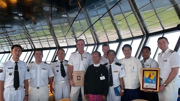 Photo caption: Captain Robert Bamberg, Master of Balmoral (fourth from left), Chief Officer Tony Fast (fifth from right), Hotel Manager Odd Kvamme (far right), and Food & Beverage Manager Mario De Azevedo Marques (second from left) exchange commemorative plaques with Myanmar officials to celebrate the ship’s maiden call at the port on 11th February 2014.