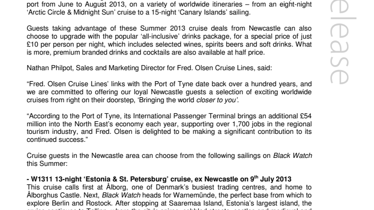 There is still a chance for Fred. Olsen Cruise Lines’ guests to take advantage of some very tempting cruise deals from Newcastle this Summer, from just £59 per person, per night*, as 804-guest Black Watch commences her cruise season from the Port of Tyne on 18th June 2013.