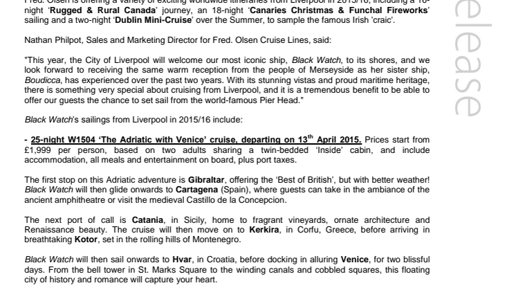Fred. Olsen Cruise Lines’ Black Watch to commence inaugural cruise season from Liverpool in Spring 2015