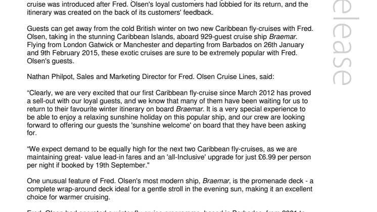Fred. Olsen launched a new January 2015 Caribbean fly-cruise on 12th August 2013 - the first time that the cruise line has operated Caribbean fly-cruising since March 2012. The first cruise was introduced after Fred. Olsen's loyal customers had lobbied for its return, and the itinerary was created on the back of its customers' feedback.