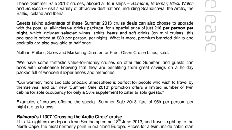 Fred. Olsen Cruise Lines launches ‘Summer Sale 2013’