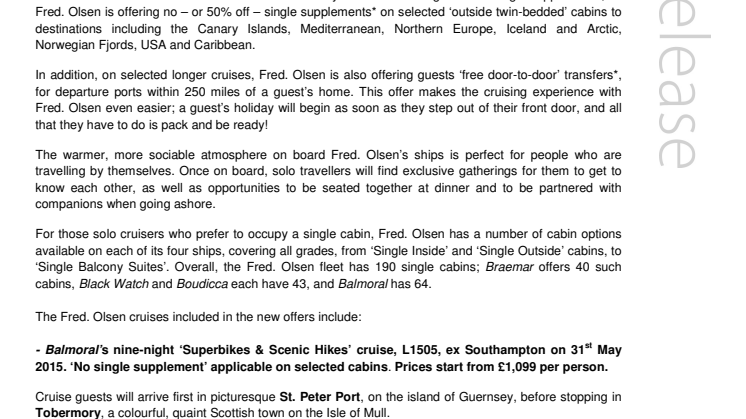 Fred. Olsen Cruise Lines launches tempting new offers for singles and free door-to-door transfers on selected 2015 cruises