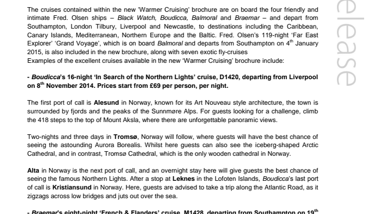 The cruises contained within the new 'Warmer Cruising' brochure are on board the four friendly and intimate Fred. Olsen ships – Black Watch, Boudicca, Balmoral and Braemar – and depart from Southampton, London Tilbury, Liverpool and Newcastle, to destinations including the Caribbean, Canary Islands, Mediterranean, Northern Europe and the Baltic. Fred. Olsen’s 119-night ‘Far East Explorer’ ‘Grand Voyage’, which is on board Balmoral and departs from Southampton on 4th January 2015, is also included in the new brochure, along with seven exotic fly-cruises.